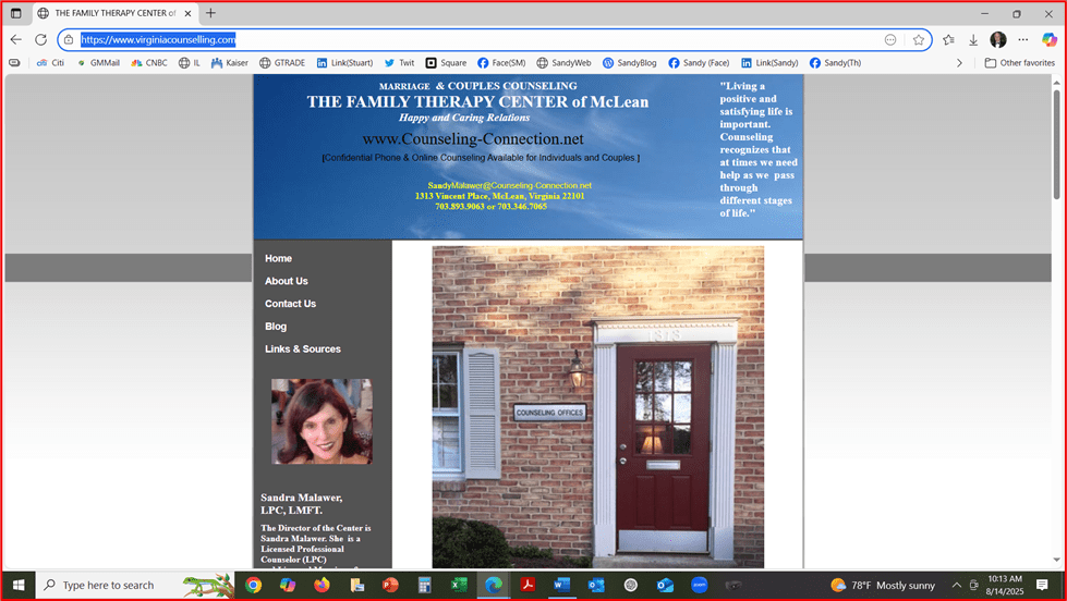 ![]() 703.893.9063. 703.346.7065 (cell). SandyMalawer@msn.com https://www.virginiacounselling.com/ |