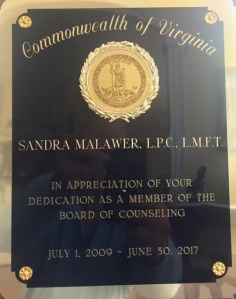 Served 8 years as a gubernatorial appointee on the Board of the Virginia Board of Counseling. This is the licensing and regulatory agency of the Commonwealth of Virginia for licensed professional counselors. A great experience. But now glad to avoid the traffic on I95.